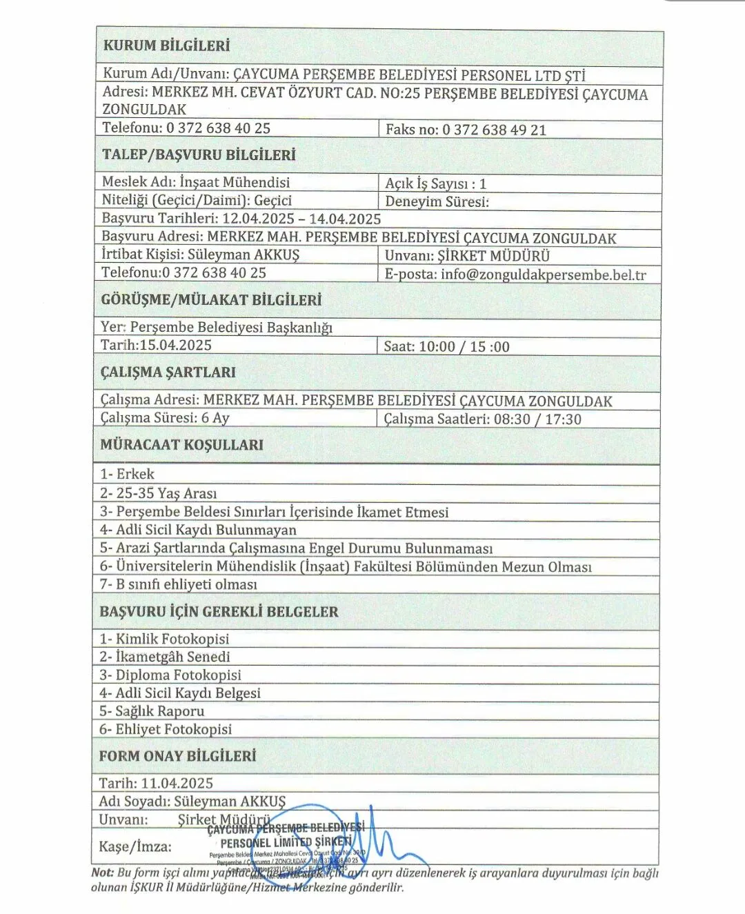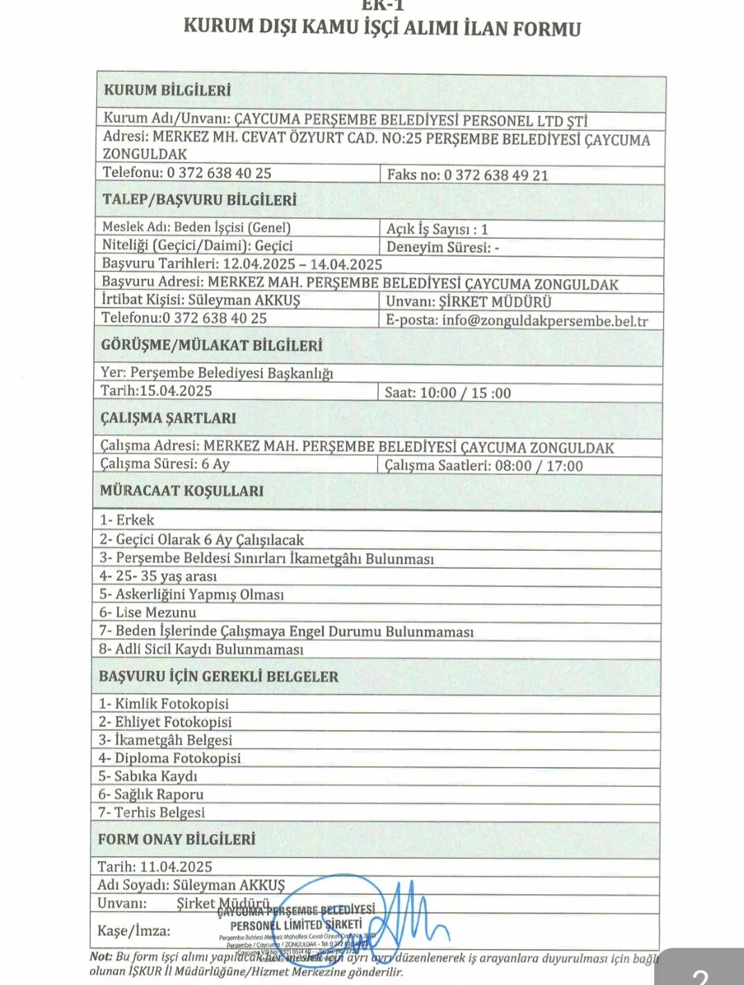 Zonguldak'ın Çaycuma ilçesi Perşembe Belde Belediyesine 1 inşaat işçisi, 1 beden işçisi olmak üzere toplam 2 işçi alınacak. Müracaat 12- 14 Nisan tarihleri arasında Belediyeye yapılacak.