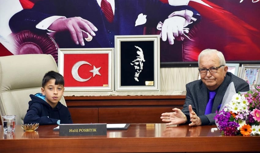 Okul Müdürü Oğuzhan Tuna, sınıf öğretmeni Gökhan Toylak ve annesi Zekiye Aras ile birlikte makama gelen Aras Tekin, Başkan Posbıyık’a çiçek takdiminin ardından koltuğa oturdu. Tekin, tüm çocukların Ulusal Egemenlik ve Çocuk Bayramı’nı kutladı.