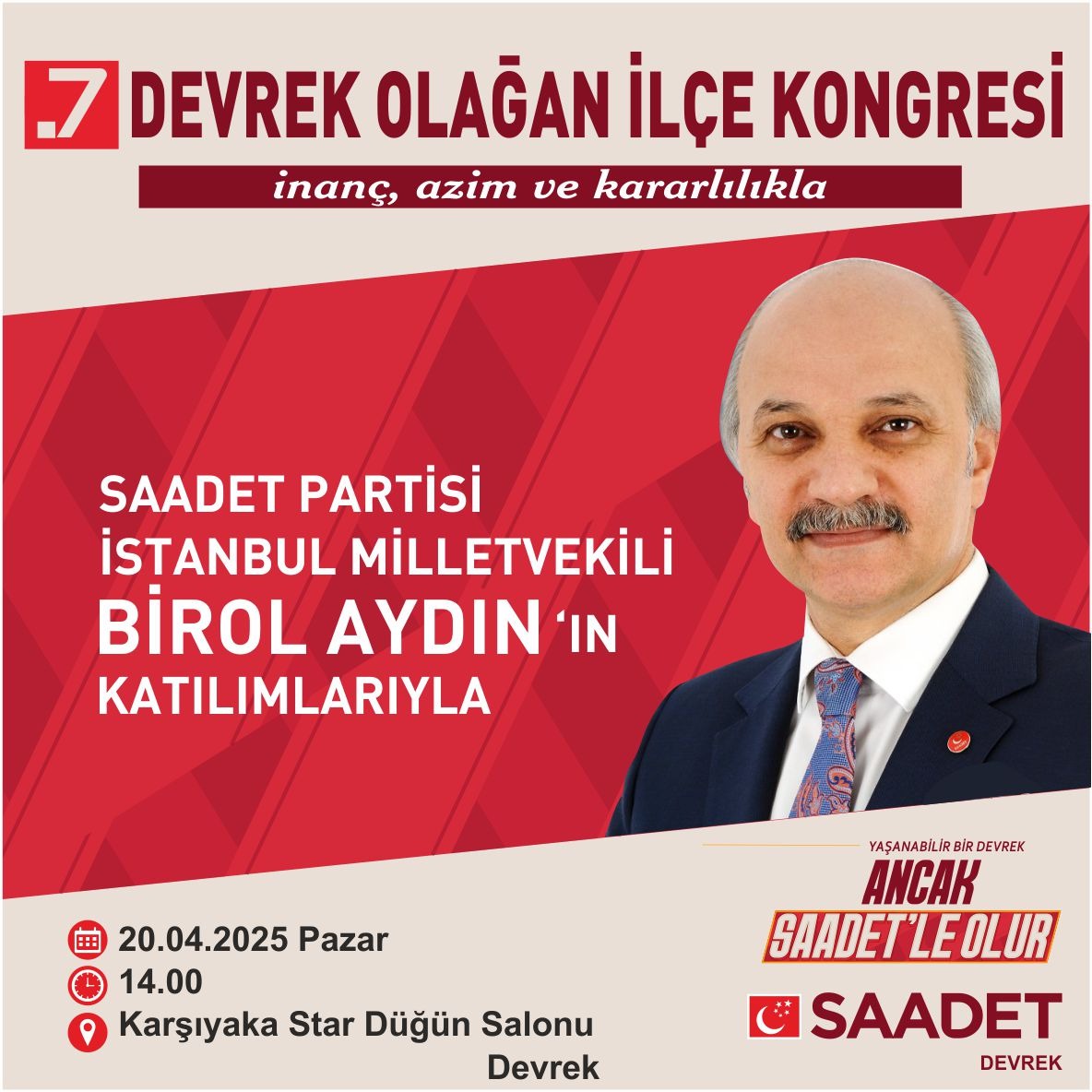 Devrek İlçe Kongresi ise 20 Nisan 2025 Pazar günü saat 14.00’te Karşıyaka Star Düğün Salonu’nda gerçekleştirilecek. Kongreye Saadet Partisi İstanbul Milletvekili Birol Aydın iştirak edecek.