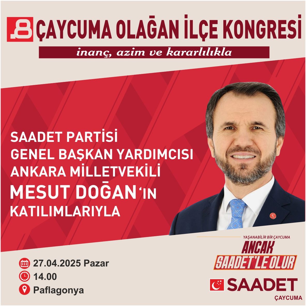 27 Nisan 2025 Pazar günü saat 14.00’te düzenlenecek Çaycuma İlçe Kongresi ise Paflogonya’da yapılacak. Bu kongrede Saadet Partisi Genel Başkan Yardımcısı ve Ankara Milletvekili Mesut Doğan konuşma yapacak.