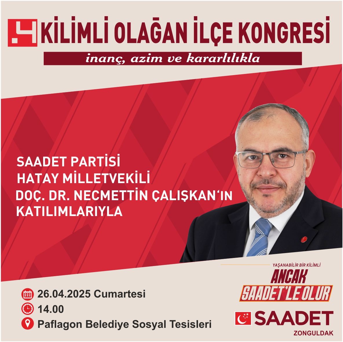 Saadet Partisi Kilimli İlçe Kongresi, 26 Nisan 2025 Cumartesi günü saat 14.00’te Paflogon Belediye Sosyal Tesisleri'nde yapılacak. Kongreye Saadet Partisi Hatay Milletvekili Doç. Dr. Necmettin Çalışkan katılacak.