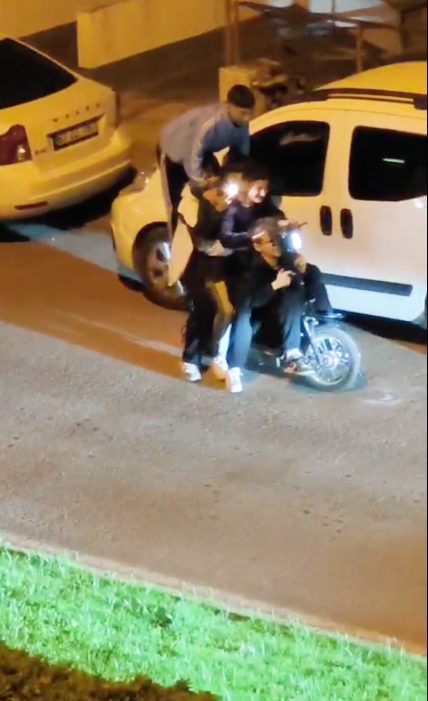 Mobilete binmeye çalışan 5 çocuktan biri mobileti kullanmaya çalışırken diğer 4 çocuk ise sıra sıra binmeye çalıştı. Görüntülere yansıyan ve tehlike arz eden oyun neyseki sorunsuz, sakatsız tamamlandı. Yaşanan anlar bir cep telefonuna saniye saniye yansıdı.
