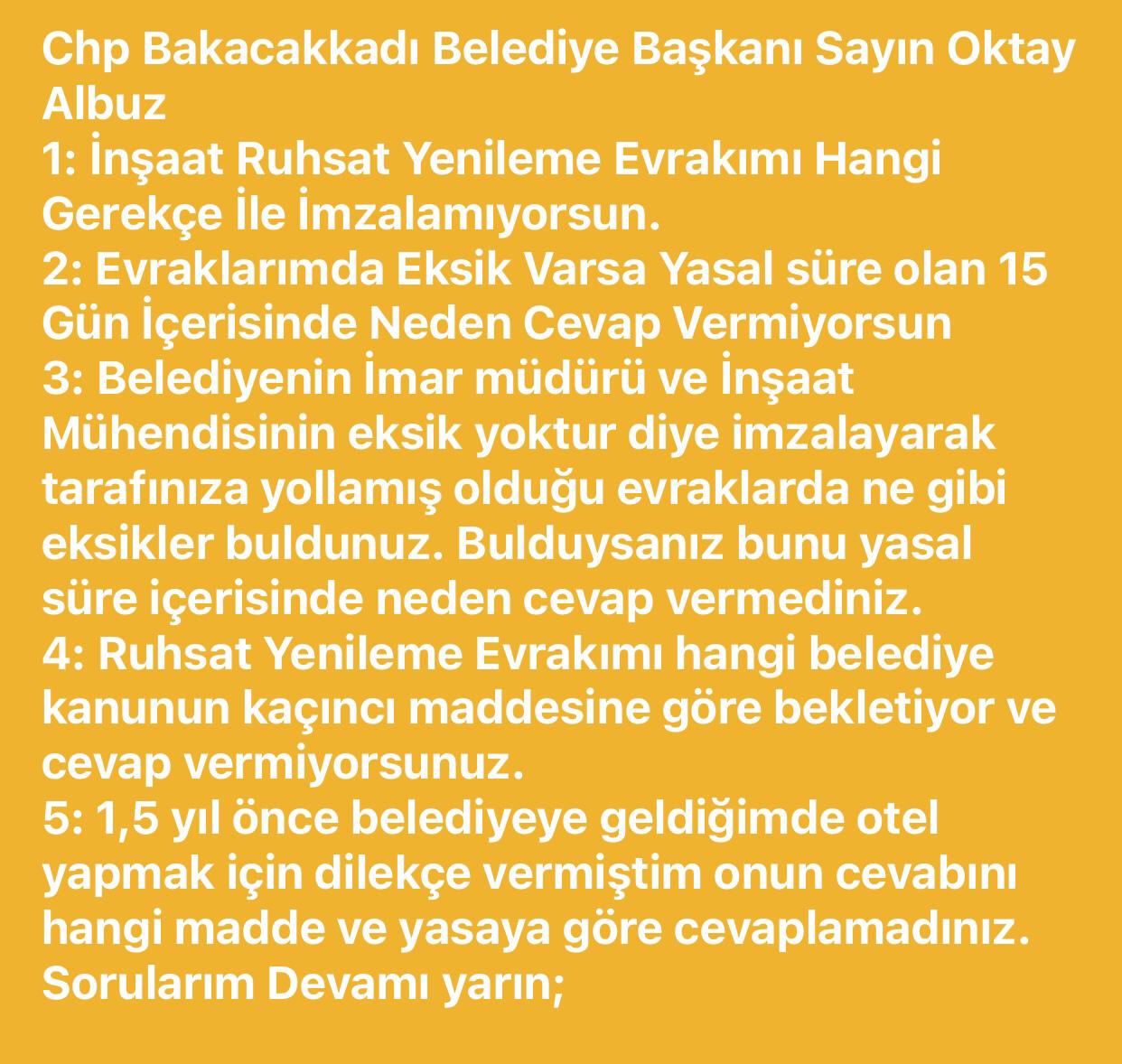 AK Parti eski İl Yönetim Kurulu Üyesi Serkan Aycı, inşaat ruhsatı yenileme süreciyle ilgili olarak Başkan Albuz’a bir dizi soru yöneltti.