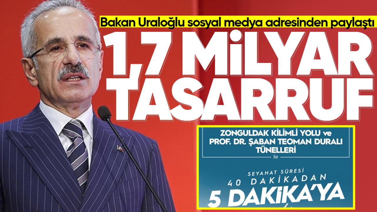 Bakan Uraloğlu, projeyle birlikte seyahat süresinin 40 dakikadan 5 dakikaya düştüğünü vurguladı. Uraloğlu ayrıca zaman tasarrufunun ekonomik karşılığının da büyük olduğuna dikkat çekerek, “Kilimli Yolu ve Duralı Tünelleri sayesinde zamandan yıllık 1,7 milyar lira tasarruf sağladık” ifadelerini kullandı.
