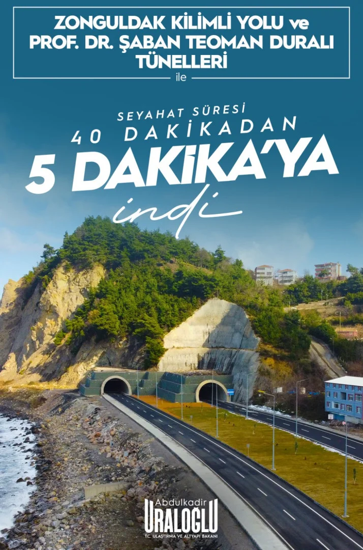 Ulaştırma ve Altyapı Bakanı Abdulkadir Uraloğlu, sosyal medya hesabından yaptığı açıklamada Zonguldak’ta hizmete açılan Kilimli Yolu ve Prof. Dr. Şaban Teoman Duralı Tünelleri’nin bölge ulaşımına önemli katkı sağladığını belirtti.