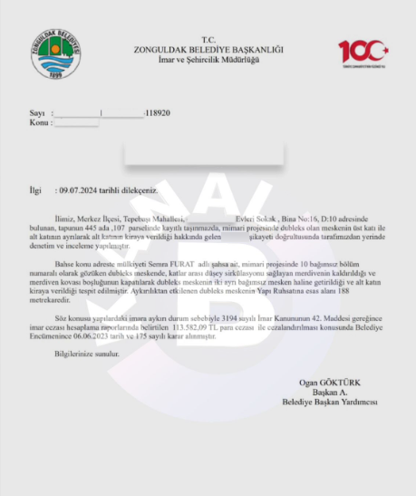 Halil Furat eşi Semra Furat’ın babasından miras kalan arsa üzerine yaptığı binada 2023 yılında yediği toplam 113 bin 582 liralık cezanın bugün ki faiziyle toplam ne kadar olduğu belirsizliğini korurken usulsüz imarıda düzelterek eski haline getirmediği biliniyor.