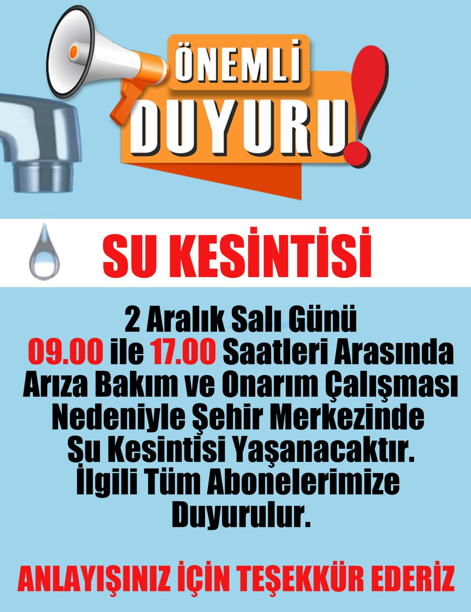 Devrek Belediyesi, 2 Aralık Salı günü (yarın) 09.00- 17.00 saatleri arasında arıza bakım ve onarım çalışması nedeniyle su kesintisi yaşanacağını duyurdu.