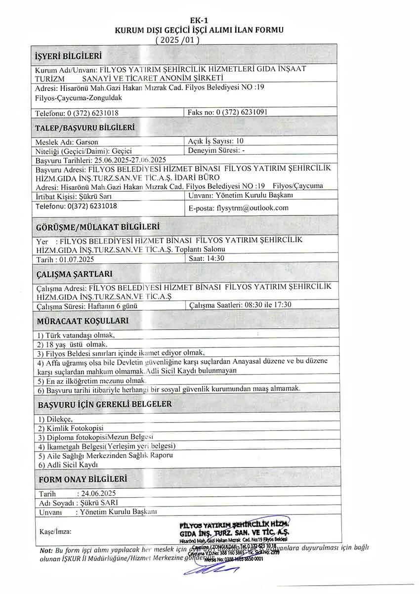 Filyos Belediyesi, bünyesinde çalıştırmak üzere 10 garson alımı yapacağını duyurdu. Başvuruların 25-27 Haziran tarihlerinde kabul edileceği açıklandı.