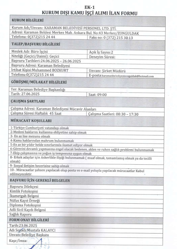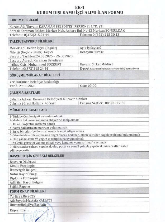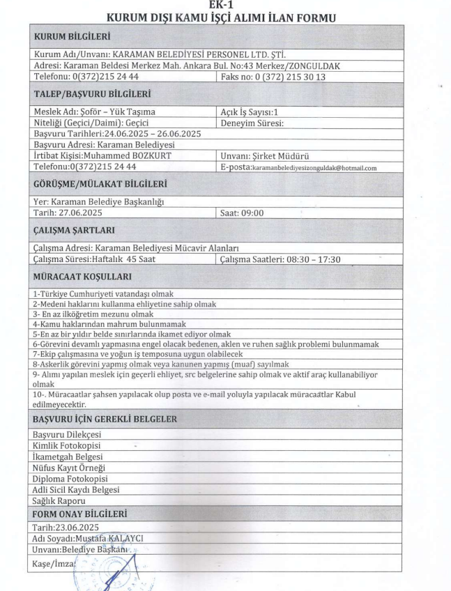 Karaman Belediyesi’ne çalıştırılmak üzere 1 şoför- yük taşıma, 2 beden işçisi, 2 büro işçisi alınacak. Başvuruların 24-26 Haziran tarihlerinde yapılacağı belirtildi.