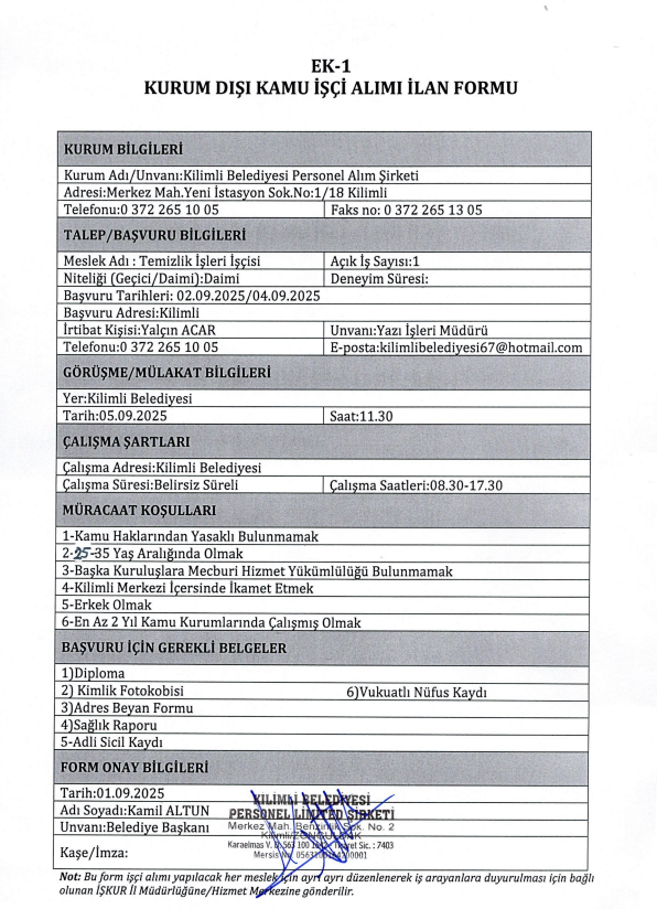 Zonguldak’ın Kilimli ilçesinde Kilimli Belediyesi’ne 1 adet daimi işçi alımı yapılacak.