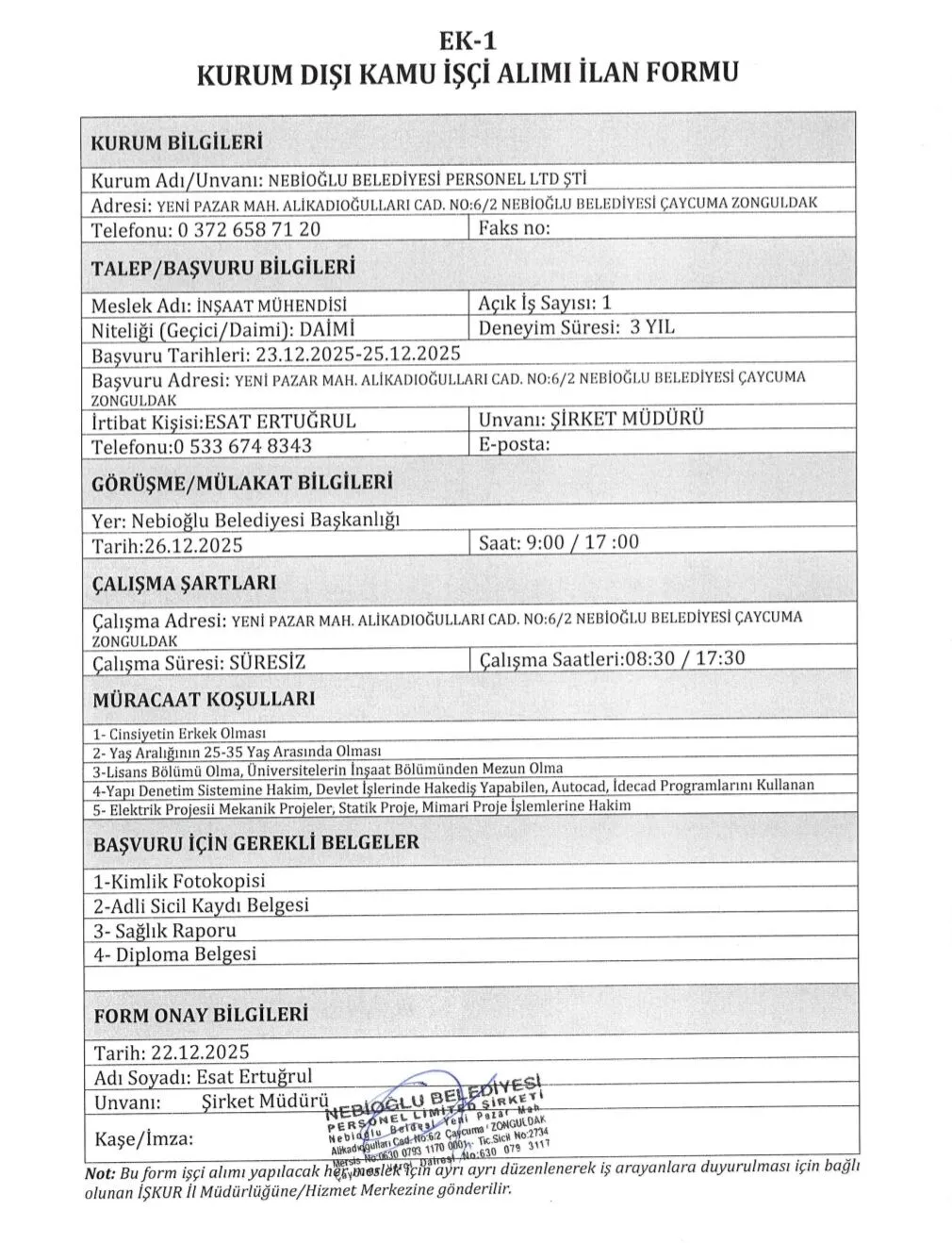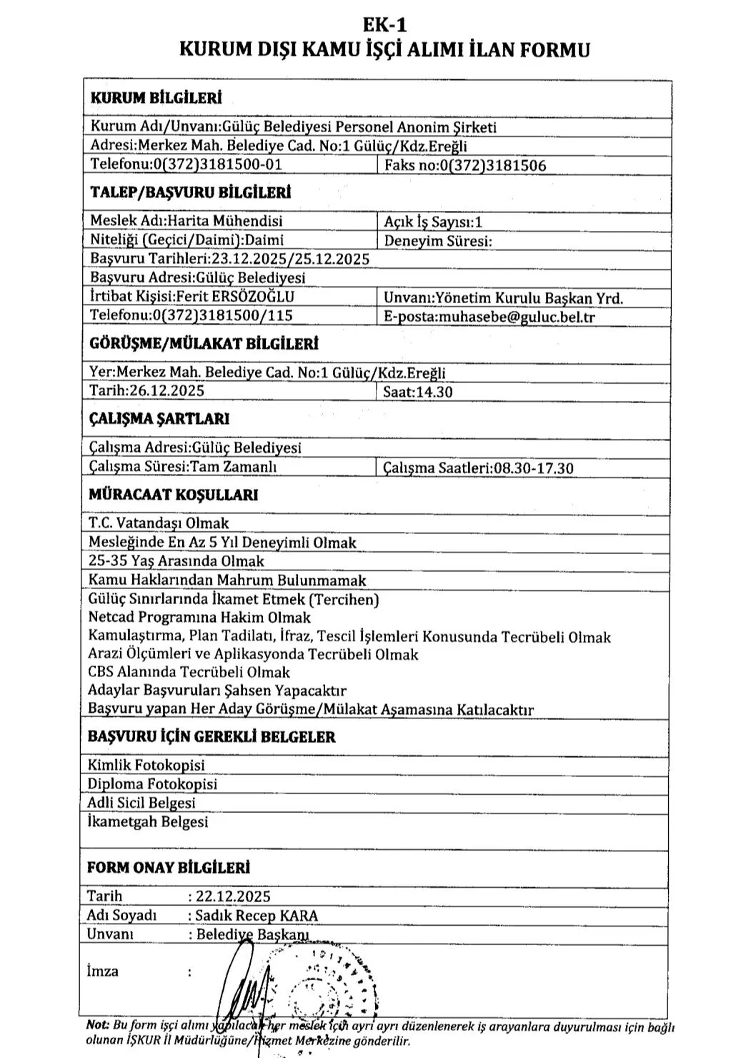 Gülüç ve Nebioğlu Belediyesi'ne İşkur üzerinden mühendis alımı yapılacak. Müracaatlar 23-25 Aralık tarihleri arasında Gülüç ve Nebioğlu Belediyesi'ne yapılacak.