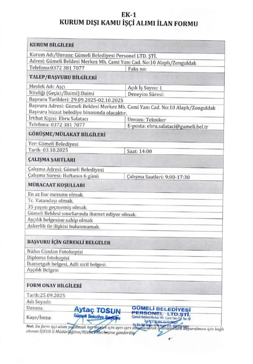 Gümeli Belediyesi'ne İŞKUR üzerinden 1 daimi aşçı alınacak. Müracaatlar 29 Eylül - 02 Ekim tarihleri arasında Gümeli Belediyesi'ne yapılacak.