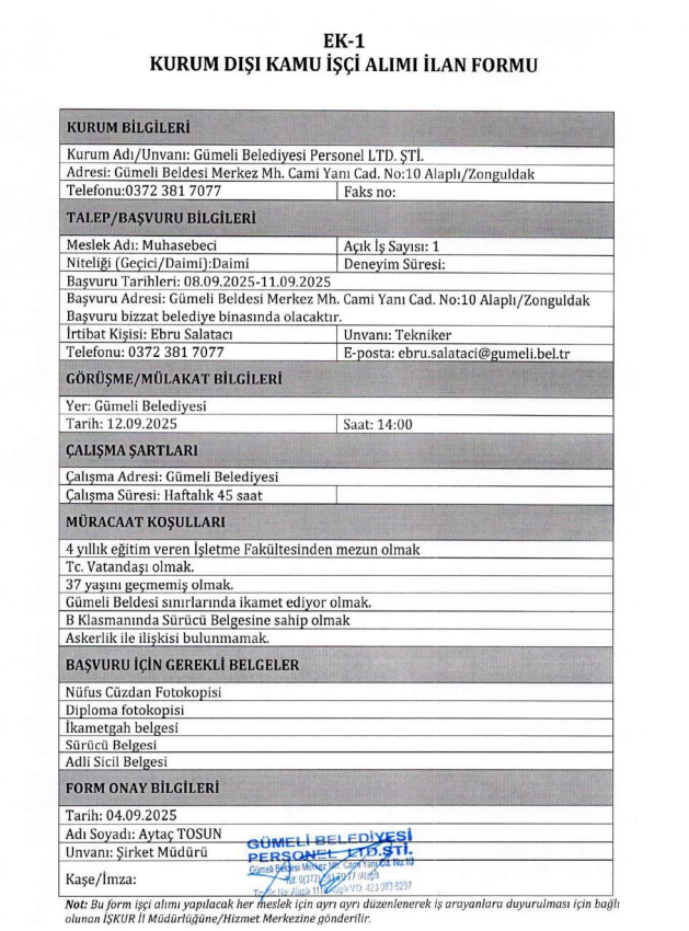 Gümeli Belediyesi İŞKUR üzerinden muhasebeci personel alımı yapacak. Müracaatlar 8 Eylül’de başlayıp, 11 Eylül’de sona erecek.