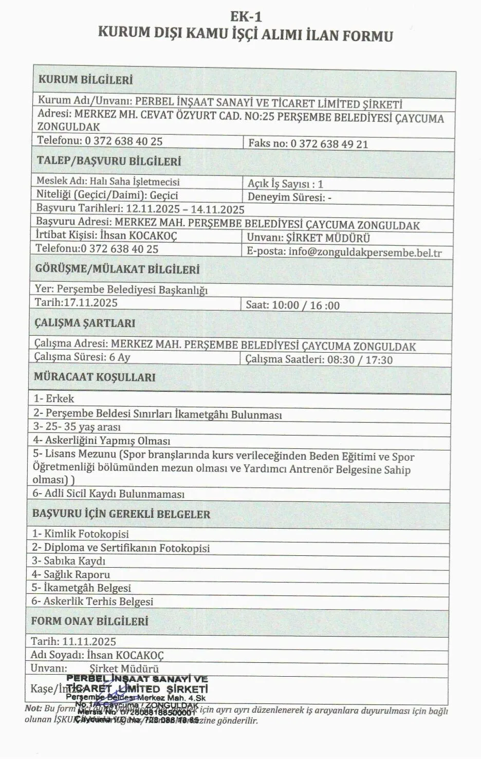 Perşembe Belediyesi'ne İşkur üzerinden 1 halı saha işletmecisi alınacak. Müracaatlar 12-14 Kasım 2025 tarihleri arasında Perşembe Belediyesi'ne yapılacak.