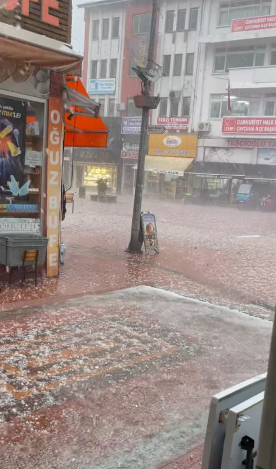 Zonguldak’ın Çaycuma ilçesinde öğle saatlerinde aniden bastıran sağanak yağışla birlikte etkili olan dolu, ilçe genelinde kısa süreli paniğe neden oldu. Nohut büyüklüğündeki dolu taneleri, cadde ve sokakları beyaza bürürken, yaşamı olumsuz etkiledi.