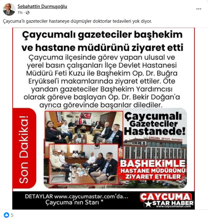 İYİ Parti Çaycuma İlçe Başkanı Sebahattin Durmuşoğlu, dün ilçede görev göre yerel ve ulusal basın mensuplarının Çaycuma Devlet Hastanesi Başhekimine ve hastane müdürü ziyareti sonrası yaptığı paylaşımı adeta skandala imza attı.