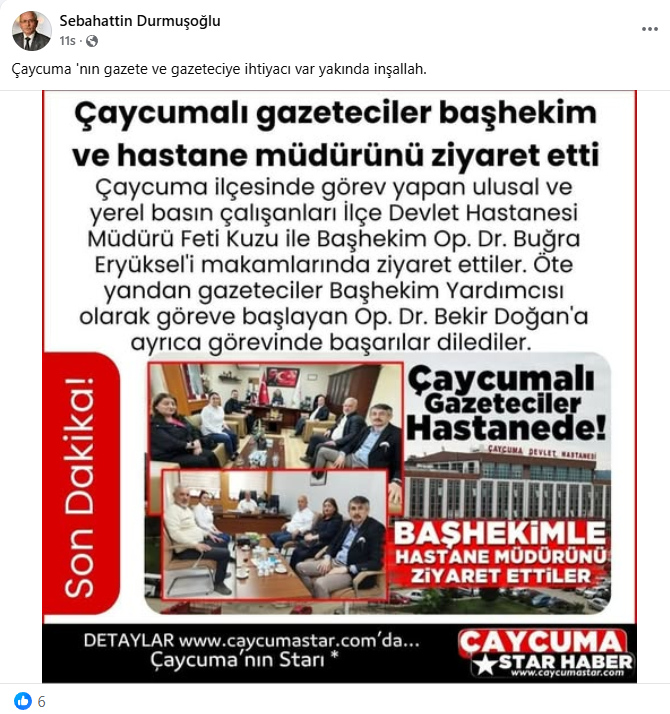 Durmuşoğlu sosyal medya adresinde gazetecilerin ziyaret fotolarını paylaşarak: “Çaycumalı gazeteciler hastaneye düşmüşler, doktorlar tedavileri yok diyor. Çaycuma’nın gazete ve gazeteciye ihtiyacı var inşallah” şeklinde yorum yaptı.