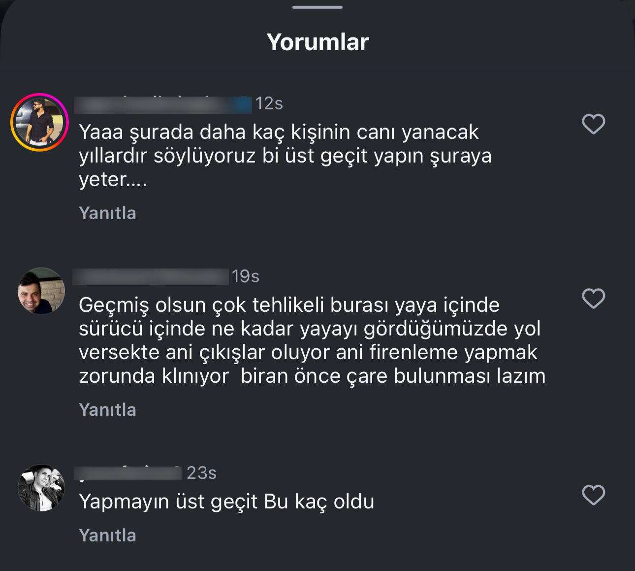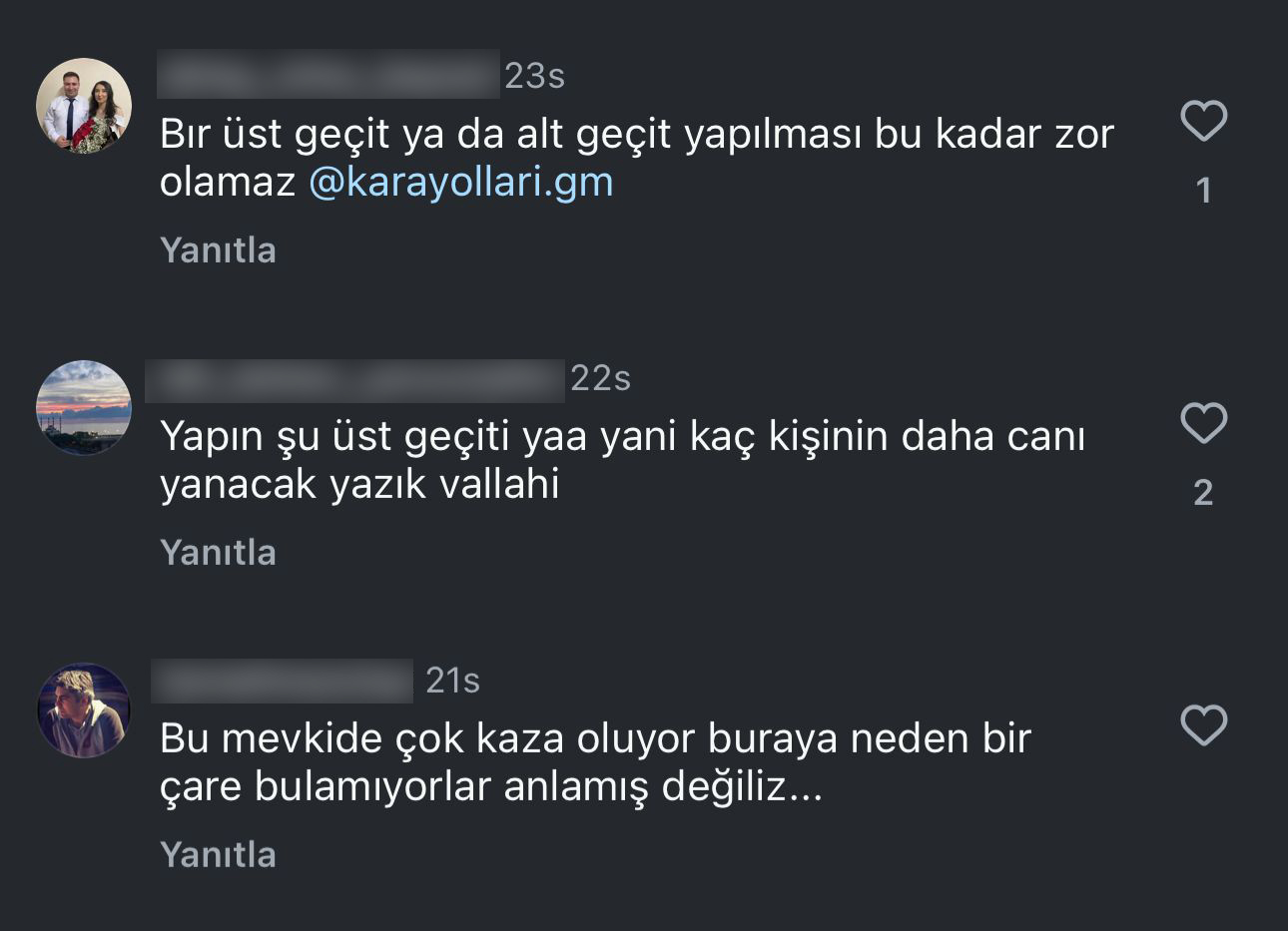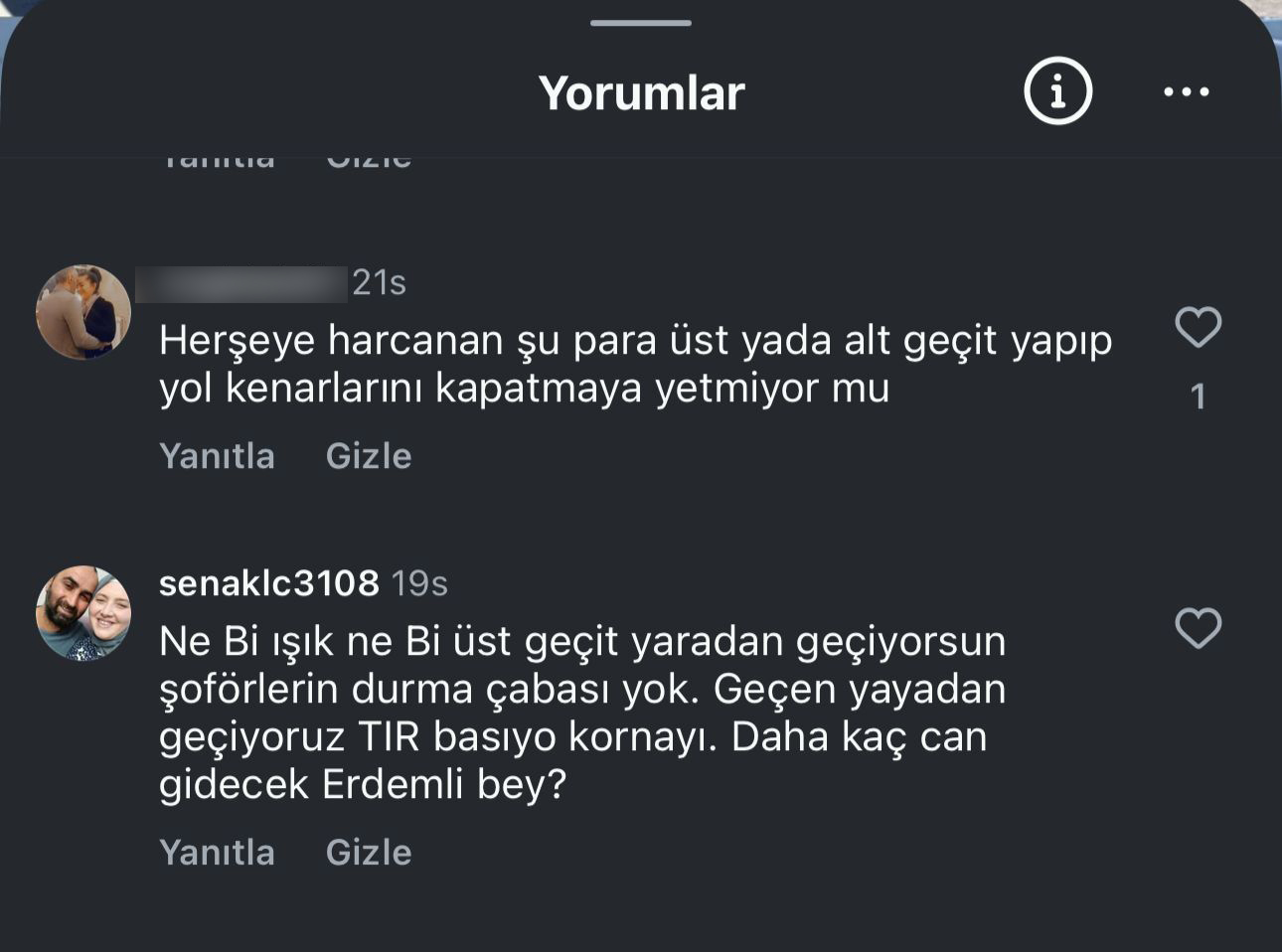 Sosyal medyada bazı vatandaşlar; ”Bir üst geçit yada alt geçit yapılması bu kadar zor olamaz, yapın şu üst geçiti ya kaç kişinin canı yanacak, daha kaç can gidecek Erdemli bey” şeklinde yorumlar yapıldı.