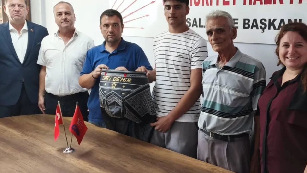 CHP İpsala İlçe Başkanlığı’nda düzenlenen buluşmada, İlçe Başkanı İsmail Göksu, Destek Orta boyunda güreşecek Zati Demir’e isminin yazılı olduğu bir kıspet hediye etti.