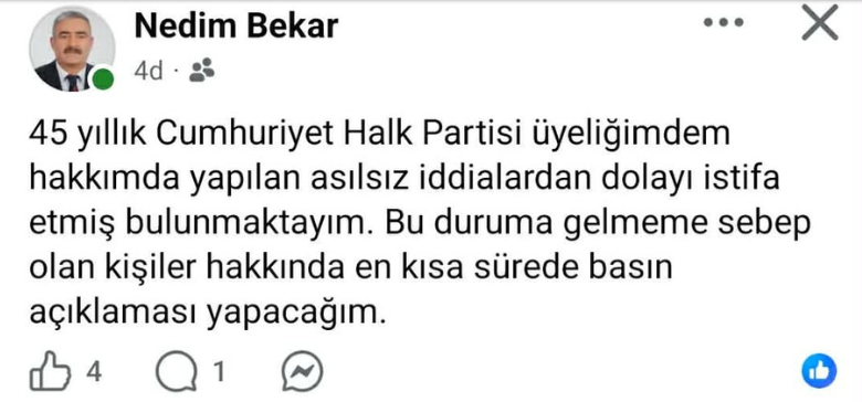 Cumhuriyet Halk Partisi (CHP)’de istifalar peş peşe gelmeye devam ediyor. Geçtiğimiz günlerde Kenan Karaveli’nin ardından şimdi de Nedim Bekar hem partisinden hem de il genel meclisi üyeliğinden istifa etti.