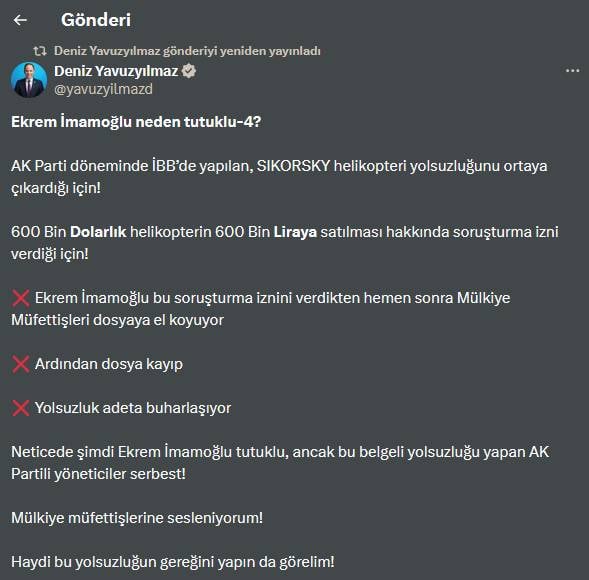 "Ekrem İmamoğlu neden tutuklu-4? AK Parti döneminde İBB’de yapılan, Sikorsky helikopteri yolsuzluğunu ortaya çıkardığı için! 600 bin dolarlık helikopterin 600 bin liraya satılması hakkında soruşturma izni verdiği için! Ekrem İmamoğlu bu soruşturma iznini verdikten hemen sonra Mülkiye Müfettişleri dosyaya el koyuyor. Ardından dosya kayıp. Yolsuzluk adeta buharlaşıyor. Neticede şimdi Ekrem İmamoğlu tutuklu, ancak bu belgeli yolsuzluğu yapan AK Partili yöneticiler serbest! Mülkiye müfettişlerine sesleniyorum! Haydi bu yolsuzluğun gereğini yapın da görelim!"