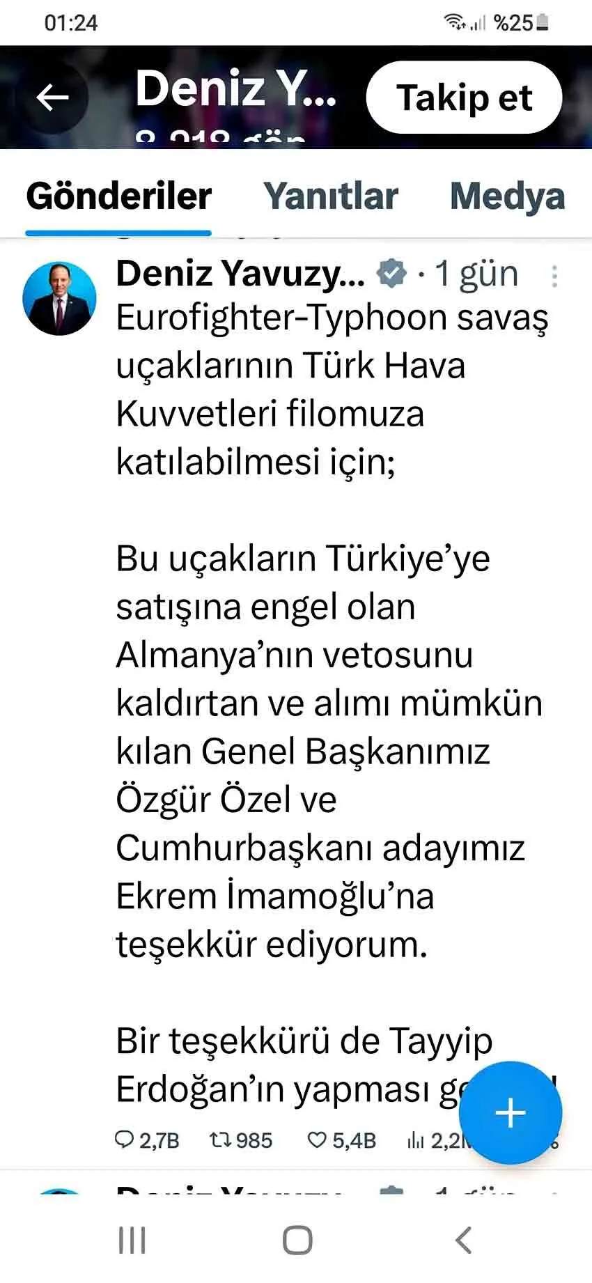 Eurofighter-Typhoon savaş uçaklarının Türk Hava Kuvvetleri filomuza kazandırılması için; Bu uçakların Türkiye’ye satışına engel olan Almanya’nın vetosunu kaldırtan ve alımı mümkün kılan Genel Başkanımız Özgür Özel ve Cumhurbaşkanı adayımız Ekrem İmamoğlu’na teşekkür ediyorum.