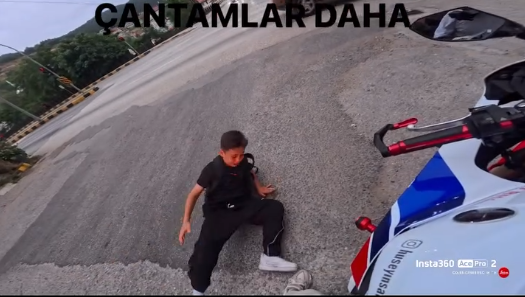 Video kayıttayken, çocuk motosikletten inerken dengesini kaybedip yere düştü. O anda Hüseyin Sarı'nın paniğe kapılmak yerine çocuğa dönüp söylediği sözler ve aralarında geçen diyalog izleyenleri kahkahaya boğdu.