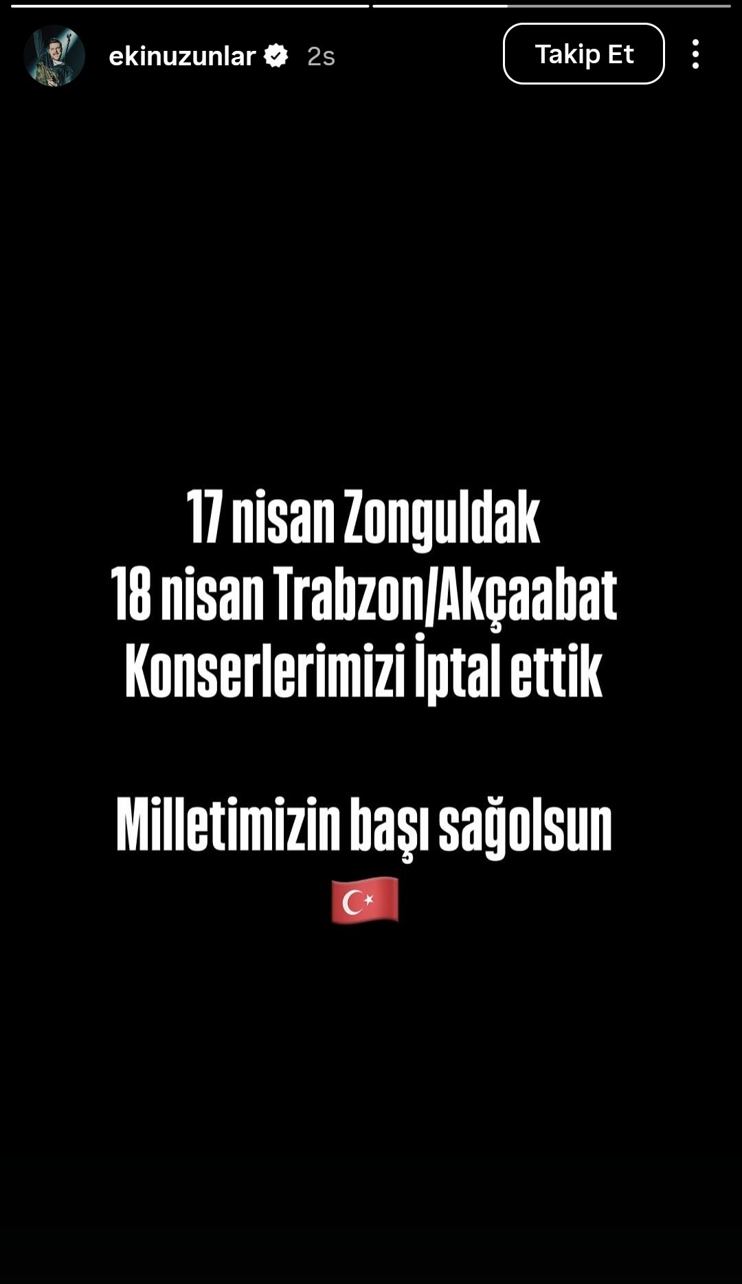 Kültür ve sanat etkinlikleriyle dolu programda sahne alması beklenen Ekin Uzunlar, Kahramanmaraş’ta meydana gelen okul saldırısının ardından konserlerini iptal ettiğini açıkladı. Sanatçının, 17 Nisan’daki Zonguldak programı ile 18 Nisan’da Trabzon’da gerçekleştireceği sahne performansını da iptal ettiği öğrenildi.