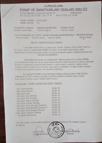 Yapılan düzenlemeye göre, Zonguldak merkez ve ilçelerinde 240 gram ekmek, yarından itibaren 20 liradan satışa sunulacak. Daha önce 15 liradan satılan ekmeğin fiyatı, belirlenen yeni tarifeyle birlikte güncellenmiş oldu.