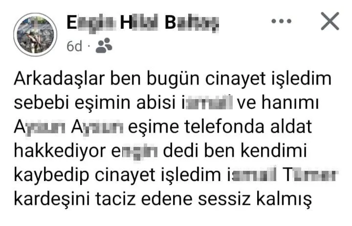 "Arkadaşlar ben bugün cinayet işledim. Sebebi, eşimin abisi İ. ve hanımı A. eşime telefonda 'Aldat, hak ediyor Engin' dedi. Ben kendimi kaybedip cinayet işledim. İ.T., kardeşini taciz edene sessiz kalmış."