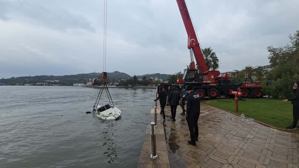 Zonguldak’ın Karadeniz Ereğli ilçesinde etkili olan fırtına ve sağanak yağış nedeniyle liman içinde batan mini yat, vinç yardımıyla karaya çıkarıldı.