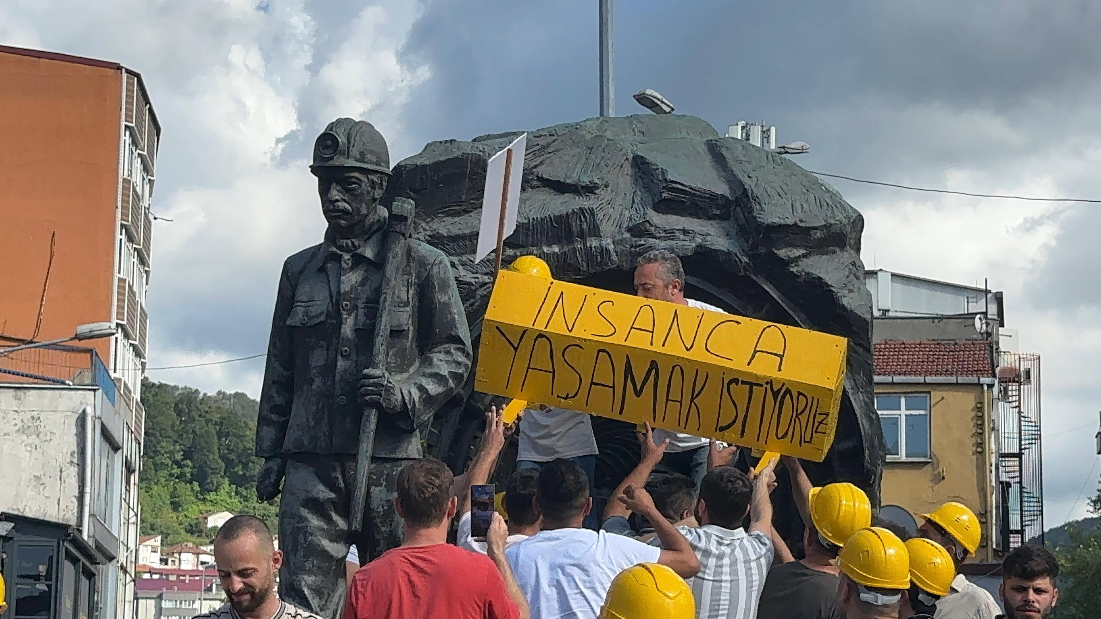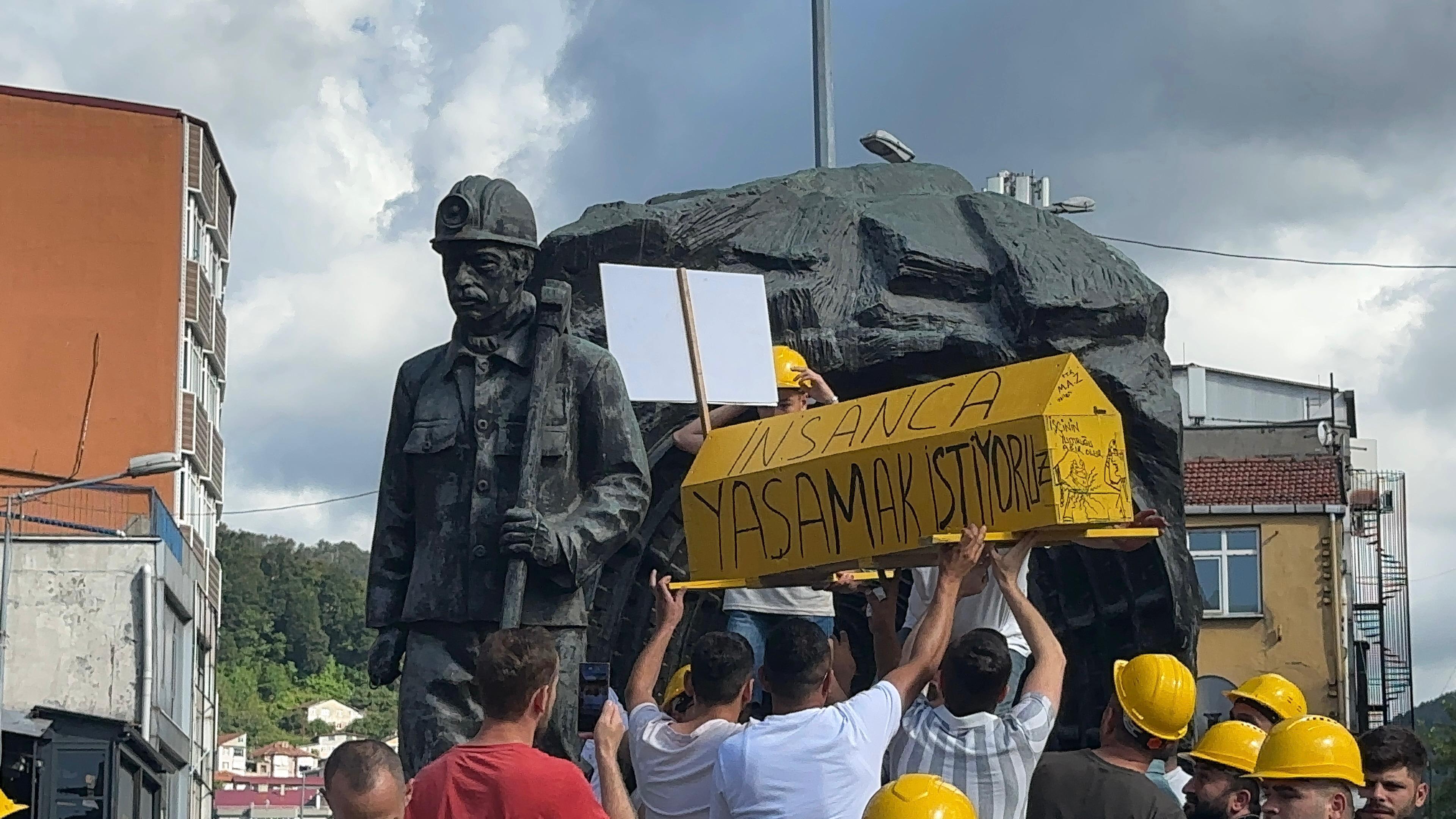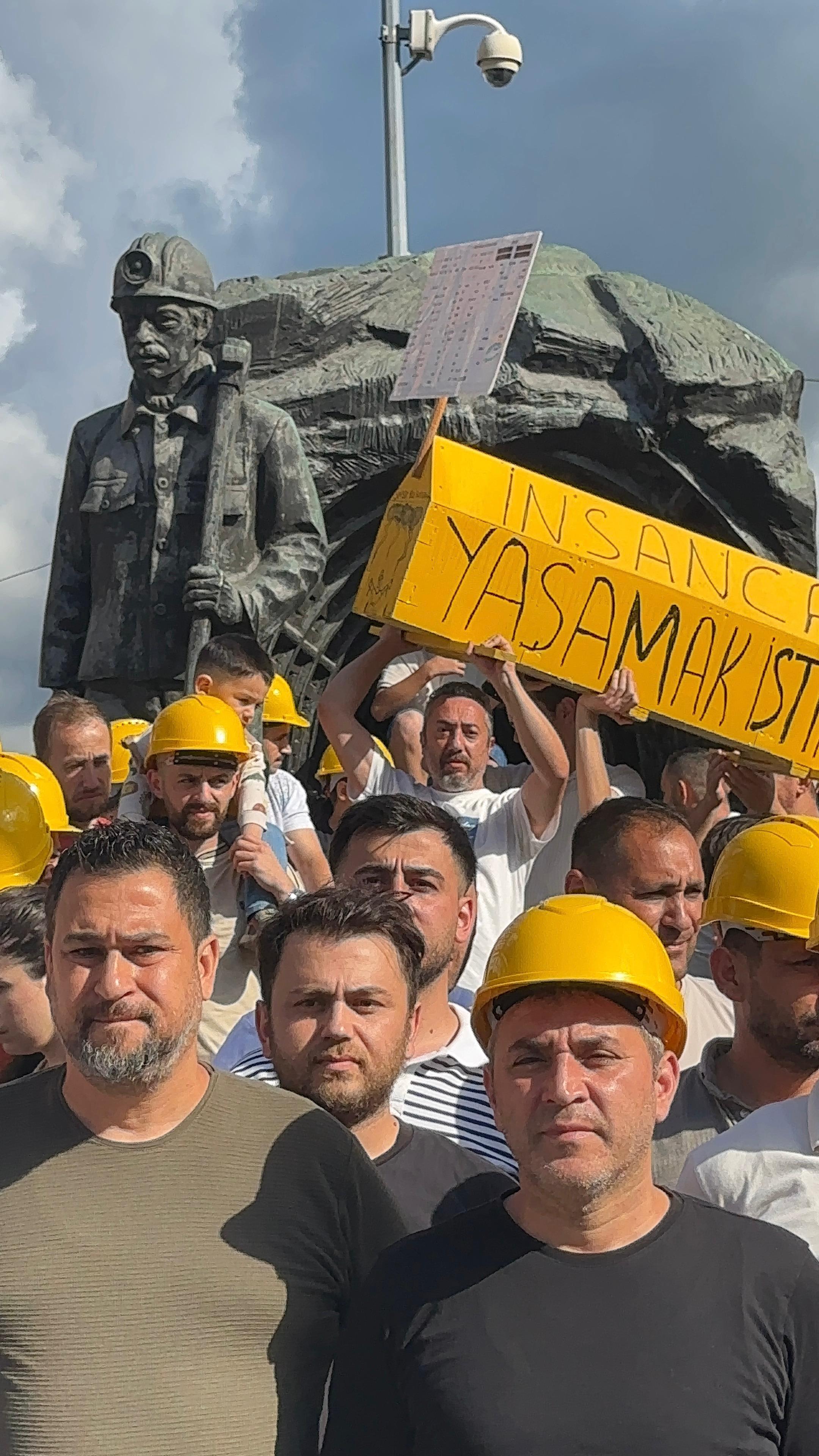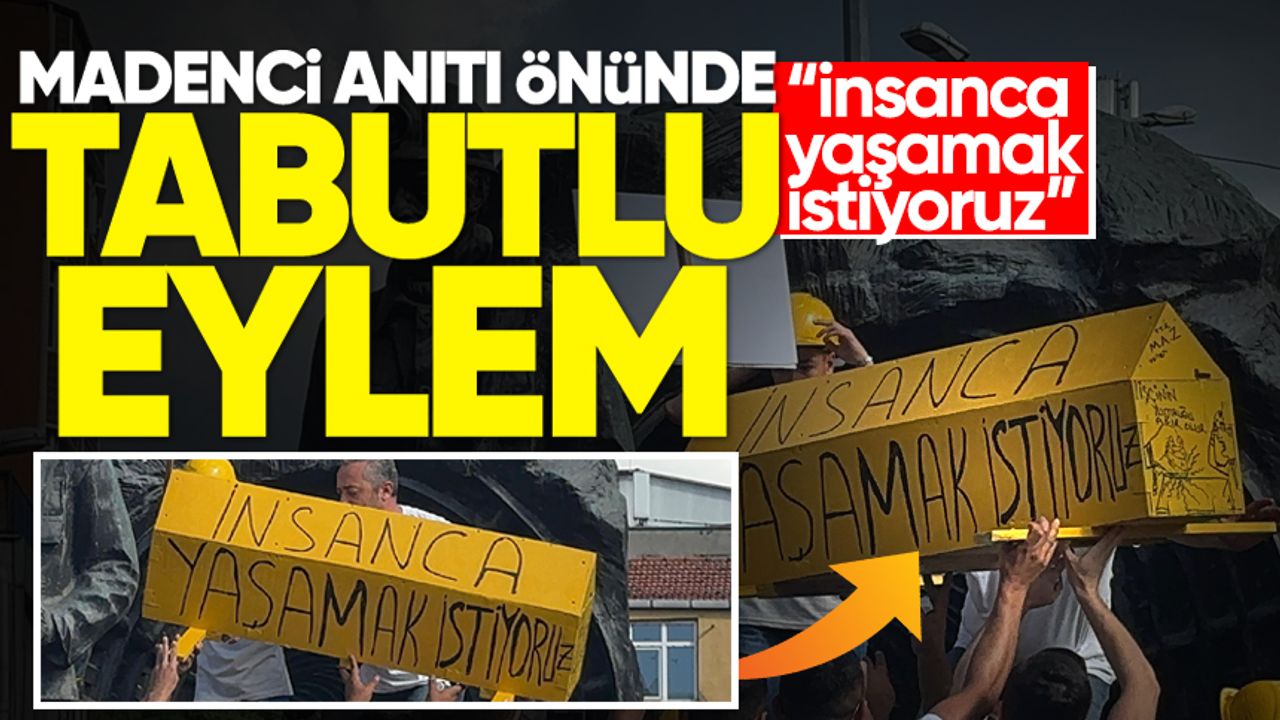 Zonguldak’ta Madenci Anıtı önünde toplanan maden işçileri, kamu işçilerini kapsayan toplu sözleşme sürecindeki ücret tekliflerine tepki göstermeye devam ediyor. Bugünkü eylemde, Genel Maden İşçileri Sendikası (GMİS) ve MTA işçileri, Madenci Anıtı’na üzerinde “İnsanca yaşamak istiyoruz” yazılı bir tabut getirdi.