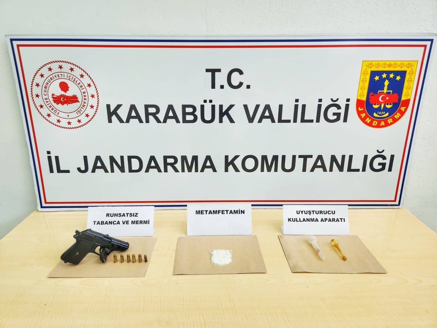 Edinilen bilgiye göre, Safranbolu Cumhuriyet Savcılığı koordinesinde Karabük İl Jandarma Komutanlığı ekipleri, 11 Ağustos 2025 tarihinde bir şüpheliye ait araç, iş yeri ve ikamet adresinde arama yaptı. Yapılan aramalarda 18,62 gram metamfetamin, 2 adet uyuşturucu kullanma aparatı, 1 tabanca, 9 el yapımı patlayıcı ve 6 fişek ele geçirildi.