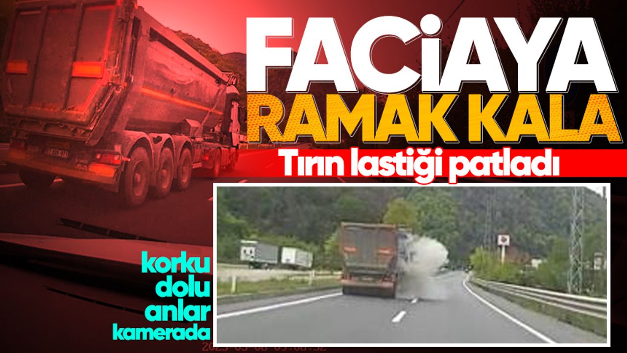 Zonguldak’ın Kozlu ilçesine bağlı Ilıksu mevkisinde, İstanbul istikametine seyir halinde olan bir tırın lastiği aniden patladı. Patlama anı, aynı güzergahtan geçen başka bir aracın araç kamerasına saniye saniye yansıdı.