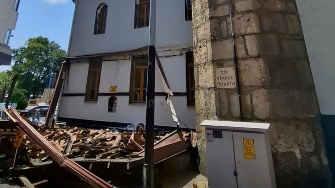 Vatandaşların özellikle de sıcak havalarda nefes aldığı, dinlendiği yer olarak bilinen İskele Camisi’ndeki sundurmanın bulunduğu alan öğlen saatlerinde yıkıldı, o an altında bulunan 2 kişi ise son anda kurtuldu.