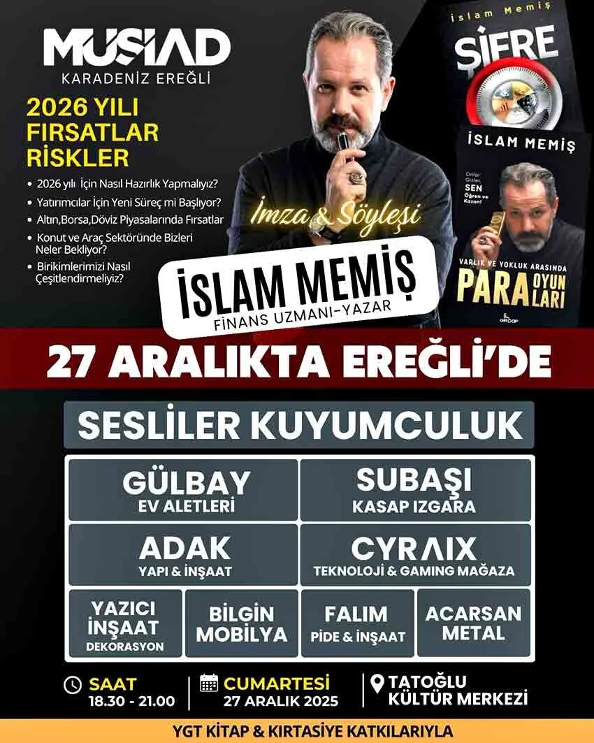 Finans Uzmanı ve Yazar İslam Memiş, yatırımcıları yakından ilgilendiren başlıkları ele almak üzere Karadeniz Ereğli’ye geliyor. Program, 27 Aralık Cumartesi günü 18.30 ile 21.00 arasında Tatoğlu Kültür Merkezi’nde gerçekleştirilecek.