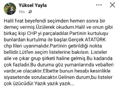 "Halil Fırat beyefendi seçimden hemen sonra bir demeç verdi. Üzülerek okudu. Halil ve onun gibi birkaç kişi CHP yi parçaladılar. Partinin kırılmau bunlardan kurtulmak ile başlar. Gerçek ATATÜRK chp lileri uyanmalıdır. Partinin getirildiği nokta bellidir. Lütfen seçim listelerine bakılsın. Listeler aile ve çıkar grup mevcut durumda.Bu kadarıda çok çalışıyor.Bu sırada göz yumanlarında veballeri vardır,ve. Kesinlikle başka bir siyasetende olacaktır. sorulacaktır.Gelinen durumda,bu listeler çok üzücüdür Yazık yazık yazık..."