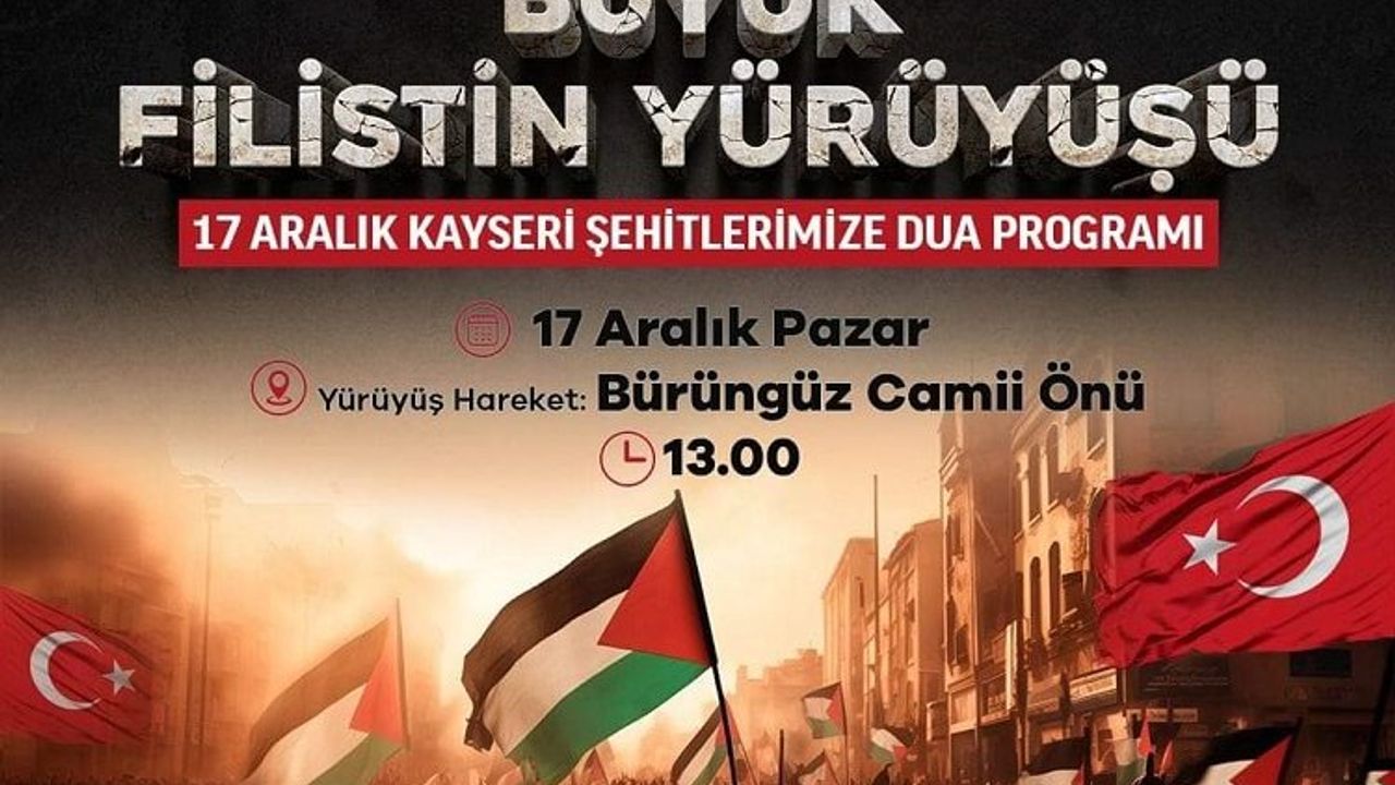 Anadolu Gençlik Derneği Kayseri Şube Başkanı Yusuf Şahin, iki haftalık bir süreç içerisinde planlamalarını yaptıklarını söylerken, "Gerekli görüşmeleri gerçekleştirdik ve artık yarını bekliyoruz. Filistin’de yaşananları gündemden düşürmeyeceğiz, normalleştirmeyeceğiz. Zalimin zulmü böyle devam edemez. Herkes bilmeli ki Filistin özgürdür. Akan kan durmadan, Filistin’in özgürlüğü kabul edilmeden bizler de durmayacağız. Kayseri bu konuda da öncülerden biri olacak. Yarın ‘Büyük Filistin Yürüyüşü’ için Kayseri’de yaşayan herkesi saat 13.00’te meydana bekliyoruz. Dünyada ses getirecek bir birliktelik için herkesi davet ediyoruz" dedi.