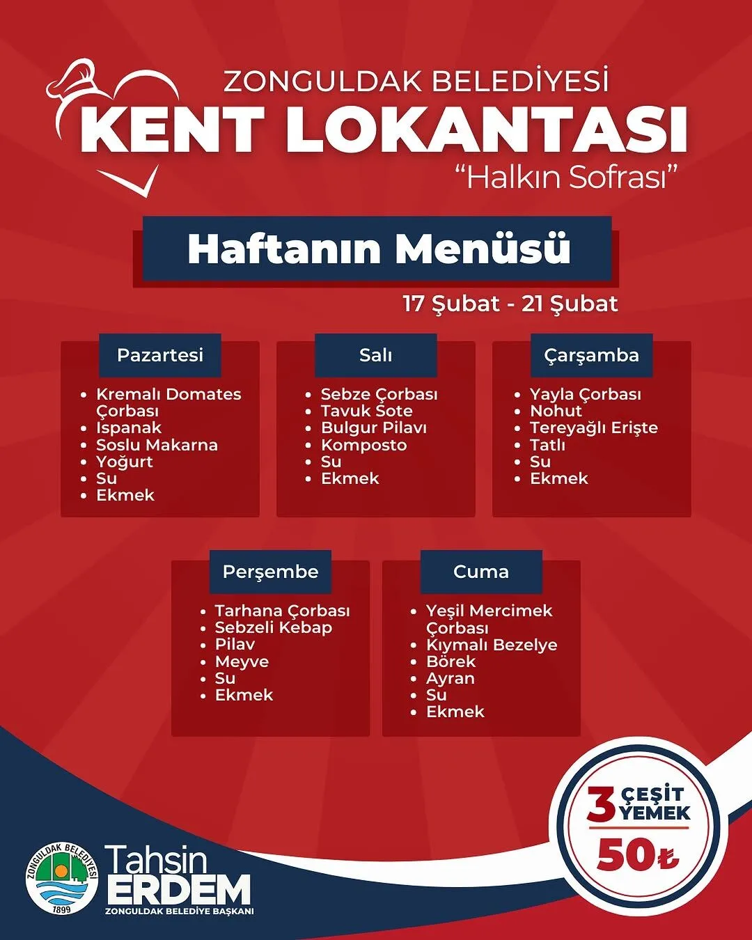 Zonguldak Kent Lokantası’nda 17-21 Şubat haftasının menüsü belli oldu. Haftanın 5 günü hizmet veren kent lokantasında vatandaşlar 3 tabak yemeği 50 liradan yeme fırsatı buluyor.