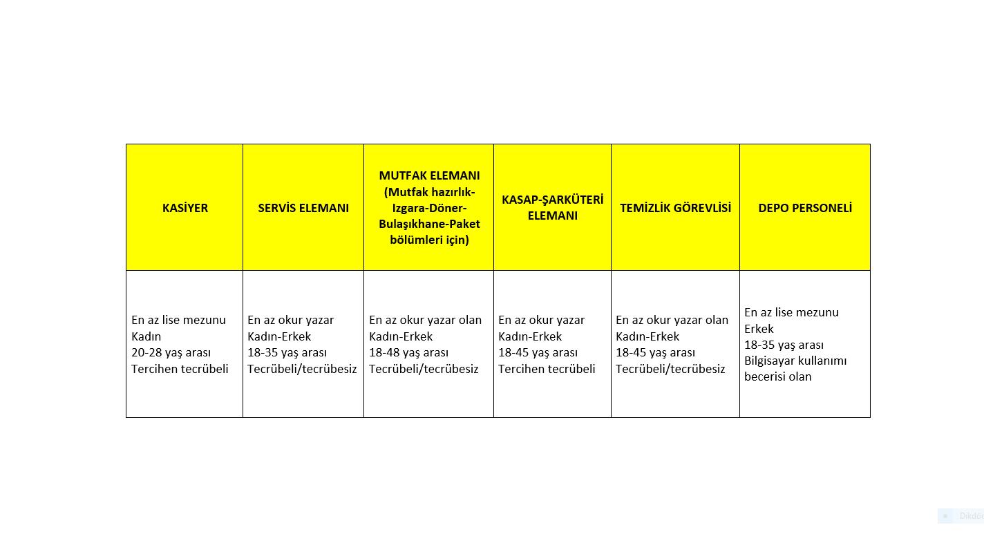22 Mutfak Elemanı (Mutfak hazırlık, ızgara, döner, bulaşıkhane, paket)