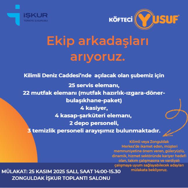 İŞKUR Zonguldak Şubesi, Zonguldak'ın Kilimli ilçesi’nde faaliyete geçecek yeni bir işletme için istihdam yapılacağını duyurdu. Ülke genelinde şubeleri bulunan Köfteci Yusuf, Kilimli Deniz Caddesi’nde açılacak yeni şubesi için toplam 37 personel alımı yapacağını açıkladı.