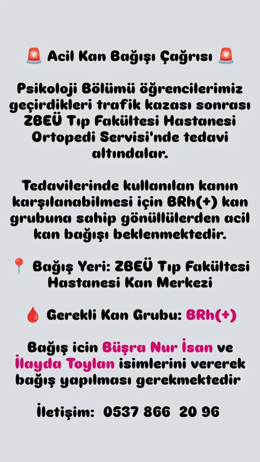 Zonguldak - Kozlu Sahil Yolunda geçtiğimiz hafta içinde meydana gelen trafik kazasında 3 üniversite öğrencisine araç çarpmıştı. Çarpmanın etkisiyle ağır yaralanan 2 kız öğrenci için kan aranıyor.