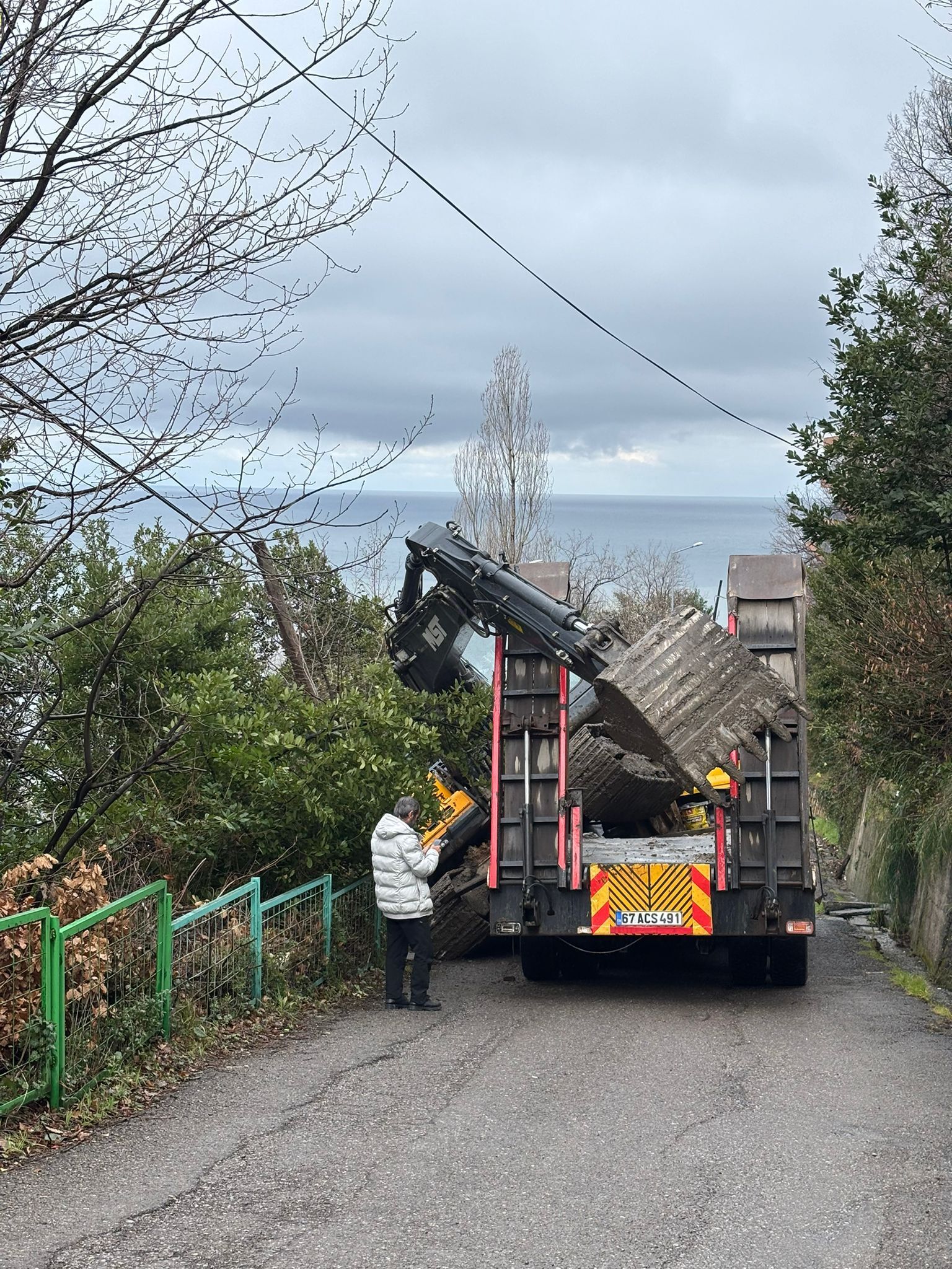 Olay, sabah saatlerinde Güney Mahallesi’nde meydana geldi. İddiaya göre 67 ACS 491 plakalı, kepçe yüklü tır yokuş aşağı indiği sırada dorsede bulunan iş makinesi dengesini kaybederek yola devrildi.