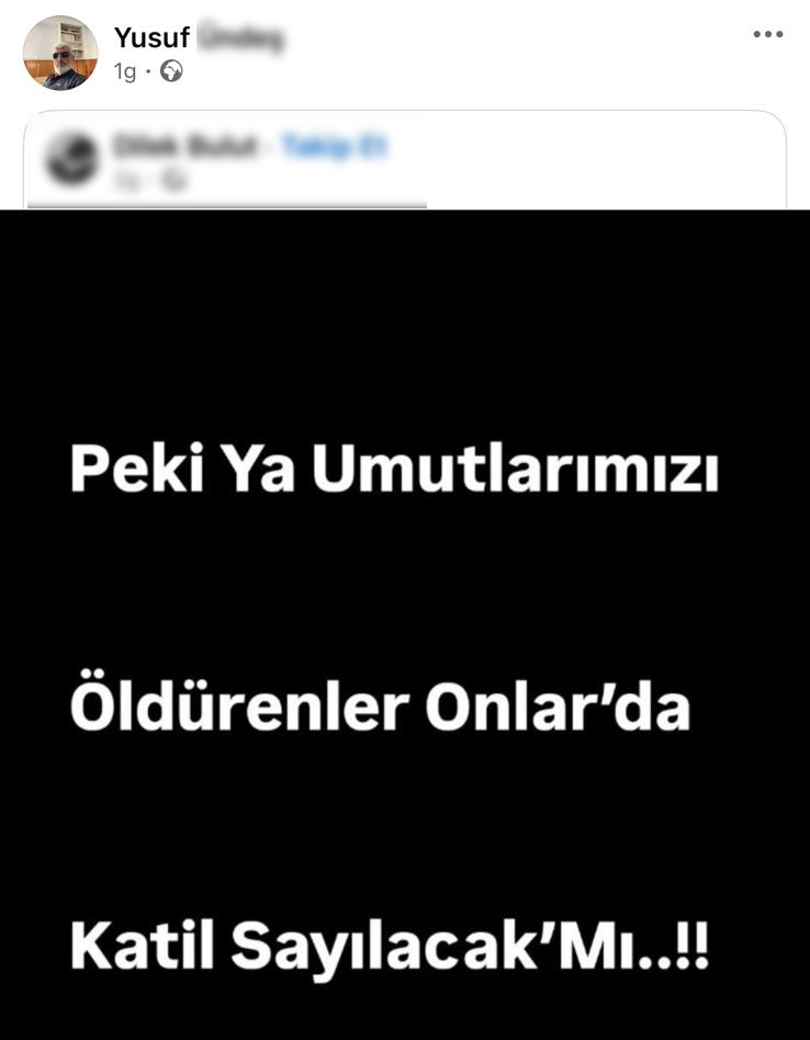 Yusuf Ü.’nün ise cinayeti gerçekleştirmeden önce sosyal medyada yaptığı paylaşımlar dikkat çekti. Yusuf Ü sosyal medyada, “Peki ya umutlarımızı öldürenler onlarda katil sayılacak mı? ve Ben kimin için savaştıysam onun kurşunu ile vuruldum” paylaşımları yaptığı görüldü.