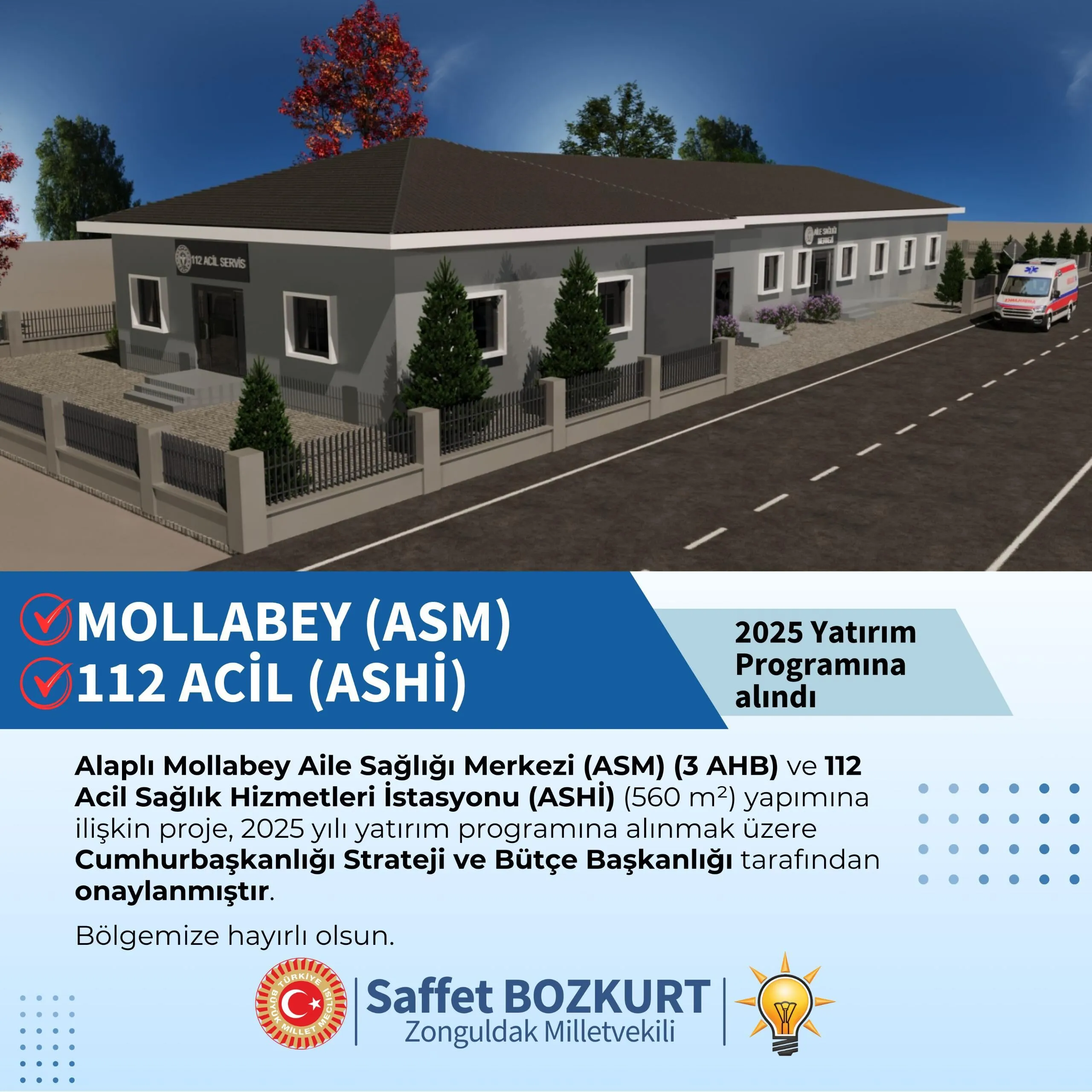Saffet Bozkurt yaptığı açıklamada; “Alaplı Mollabey Aile Sağlığı Merkezi (ASM) (3 AHB) ve 112 Acil Sağlık Hizmetleri İstasyonu (ASHİ) (560 m²) yapımına ilişkin proje, 2025 yılı yatırım programına alınmak üzere Cumhurbaşkanlığı Strateji ve Bütçe Başkanlığı tarafından onaylanmıştır. Bölgemize hayırlı olsun.” İfadelerine yer verdi.