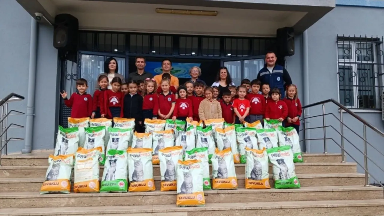Nurdan ve Ahmet Orhan Oğuz İlkokulu öğrencileri 4 Ekim Hayvanları Koruma Günü kapsamında topladıkları mamaları bakımevi ekiplerine teslim etti.