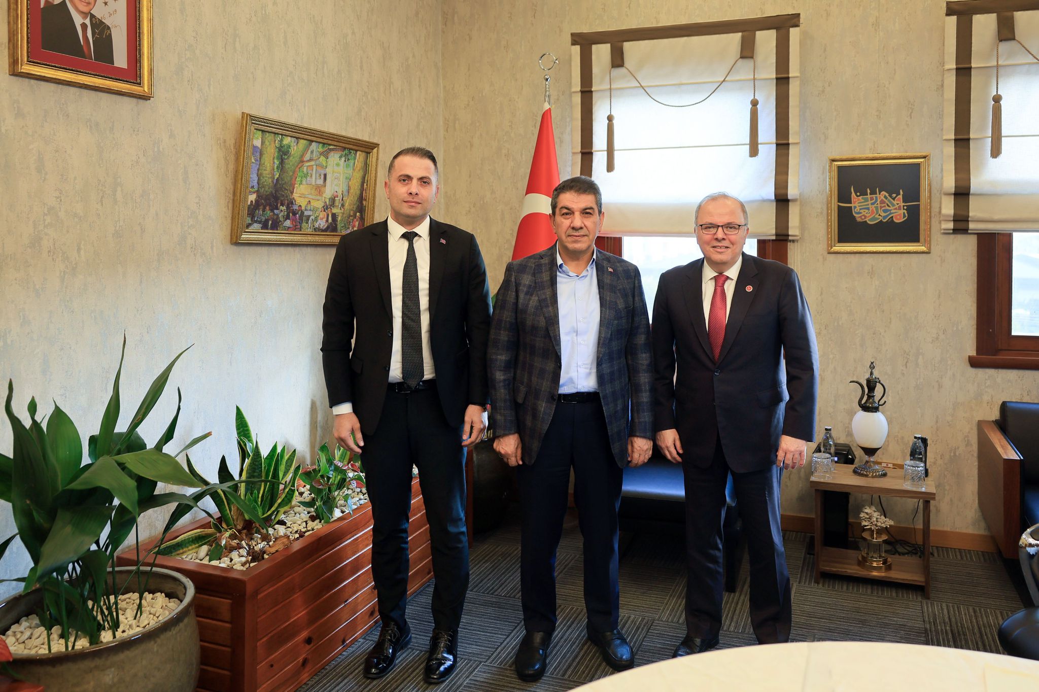 Milliyetçi Hareket Partisi (MHP) Merkez Yürütme Kurulu (MYK) Üyesi Murat Kotra, Elvanpazarcık Belediye Başkanı Ümit Uzun ile birlikte Esenler Belediye Başkanı Mehmet Tevfik Göksu’yu makamında ziyaret etti.