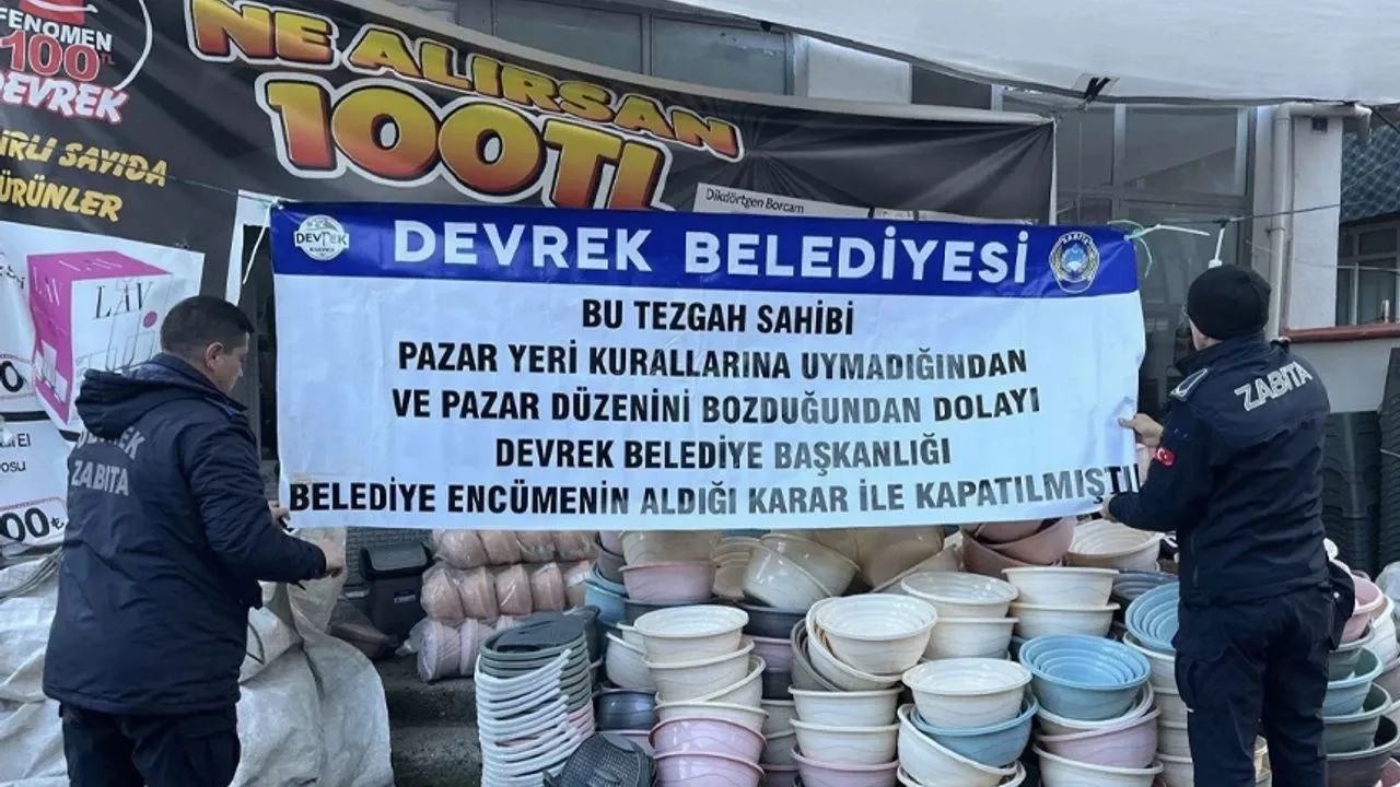 Konunun Belediye Encümeni'ne taşınmasının ardından çıkan karar neticesinde, plastik ev gereçleri satan söz konusu tezgahın kapatılmasına karar verildi. Zabıta ekipleri, kapatılan tezgahın önüne; "Bu tezgah sahibi pazar yeri kurallarına uymadığından ve pazar düzenini bozduğundan dolayı Devrek Belediye Başkanlığı Belediye Encümeni'nin aldığı karar ile kapatılmıştır" yazılı pankart asarak işlemi uyguladı.