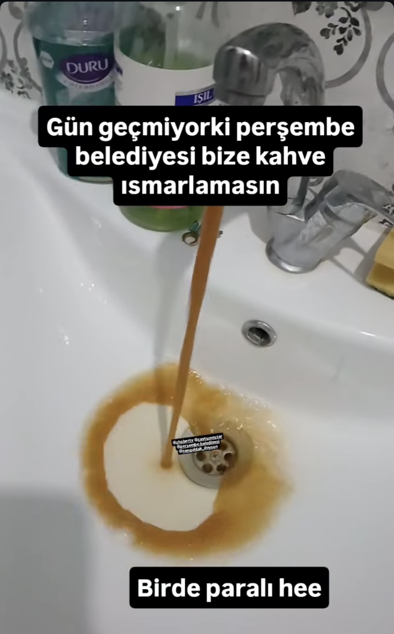 Zonguldak’ın Çaycuma ilçesine bağlı Perşembe beldesinde içme suyunun kahverengiye dönmesi vatandaşların tepkisine yol açtı. Musluğu açtıklarında bulanık ve kahverengi suyla karşılaşan vatandaşlar şaşkınlık yaşadı. Arızanın kaynağı henüz belirlenemezken, içme suyu geçici olarak kullanılamaz hâle geldi. O anları cep telefonuyla kaydeden bir vatandaş, sosyal medyada yaptığı paylaşımda, “Gün geçmiyor ki Perşembe Belediyesi bize kahve ısmarlamasın… Bir de paralı he” ifadelerini kullandı.