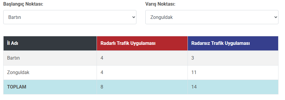 Hazırlanan sistemde, kullanıcılar Zonguldak'tan başlangıç ve varış noktası seçerek, iki şehir arasındaki trafik uygulama sayılarını görebiliyor.